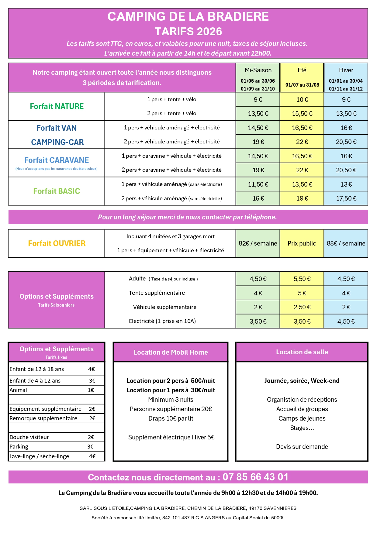 Il suffit de nous contacter via le formulaire ou par téléphone pour recevoir un devis personnalisé selon vos dates, votre type d’emplacement ou l’hébergement souhaité.